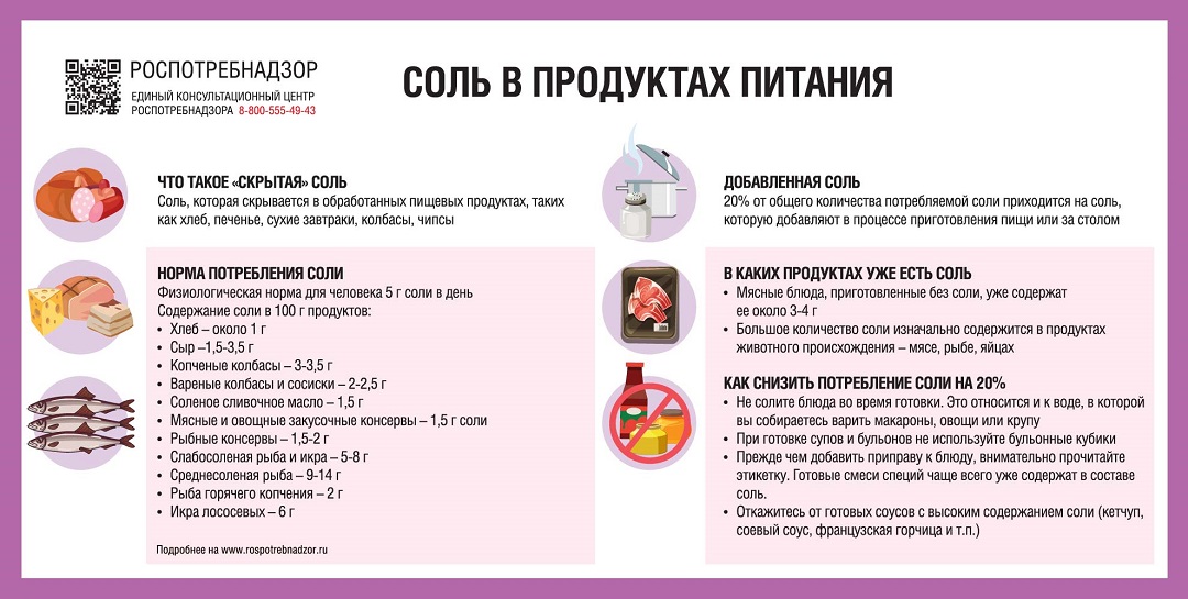 Роспотребнадзор напоминает, что около 80% соли, которую человек потребляет ежедневно, приходится на так называемую «скрытую соль». Что такое «скрытая» соль? Эта та соль, которая скрывается в обработанных пищевых продуктах, таких как хлеб, печенье, сухие завтраки, колбасы, чипсы и так далее.